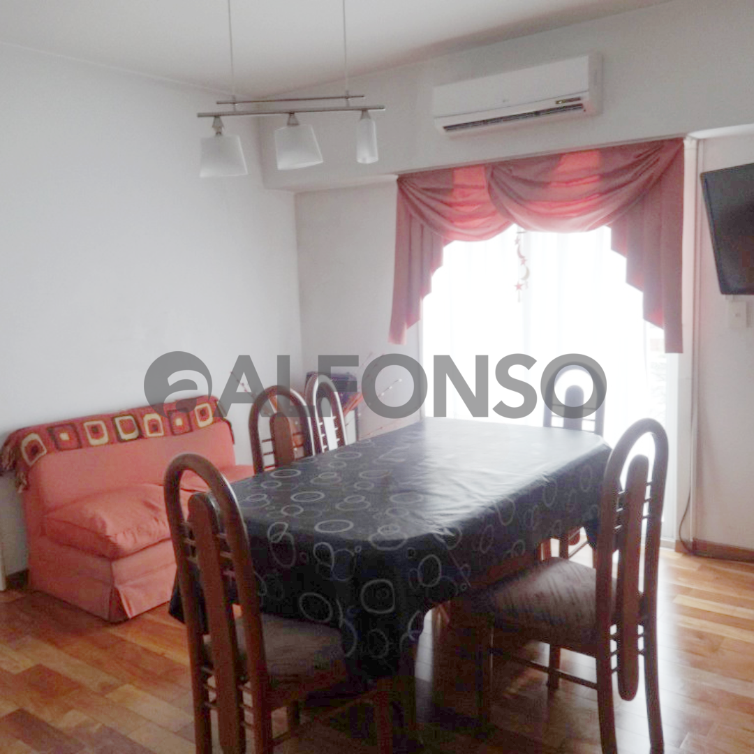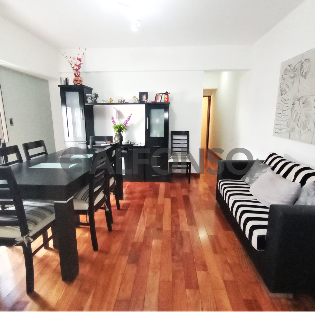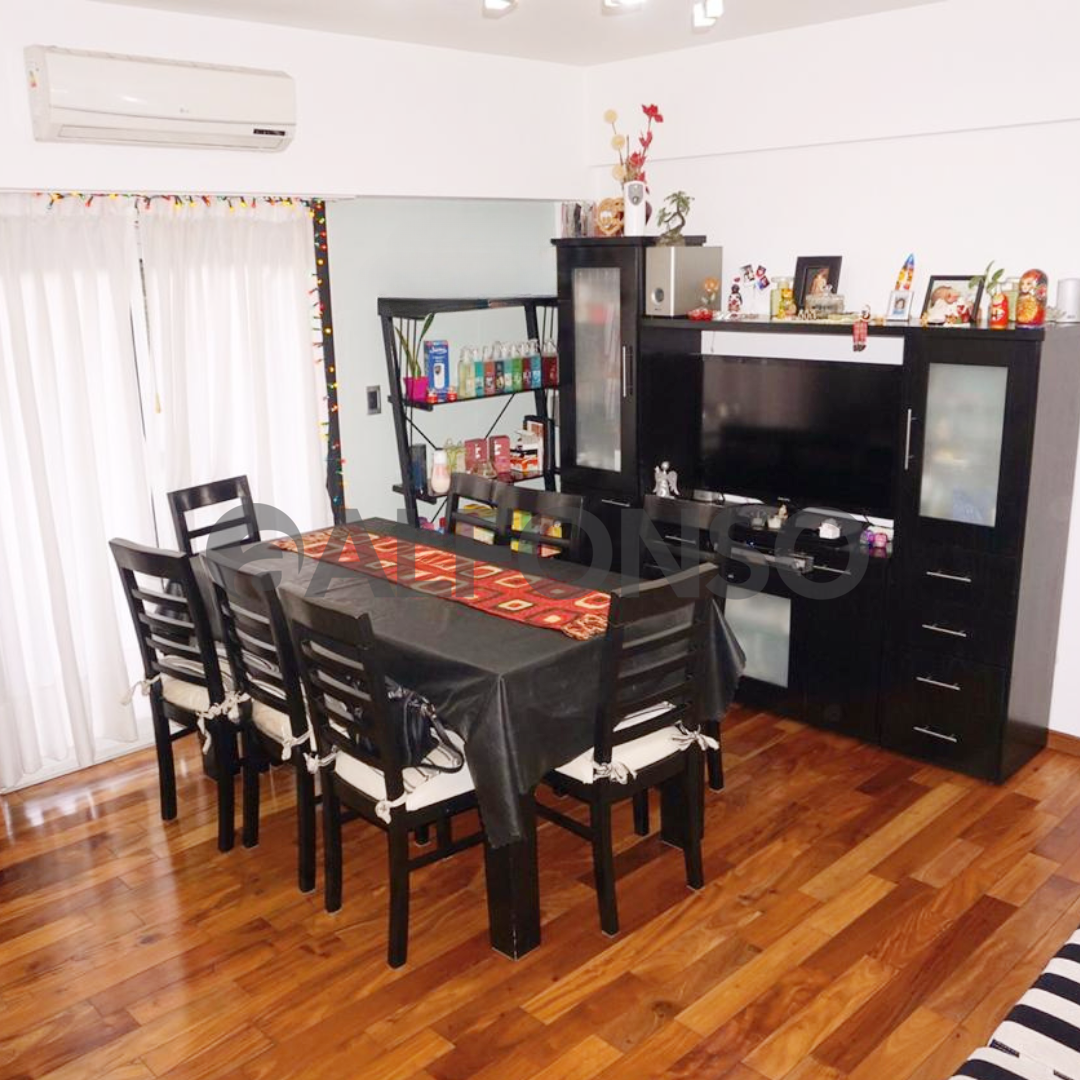 • Living comedor con pisos de madera y salida al balcón.