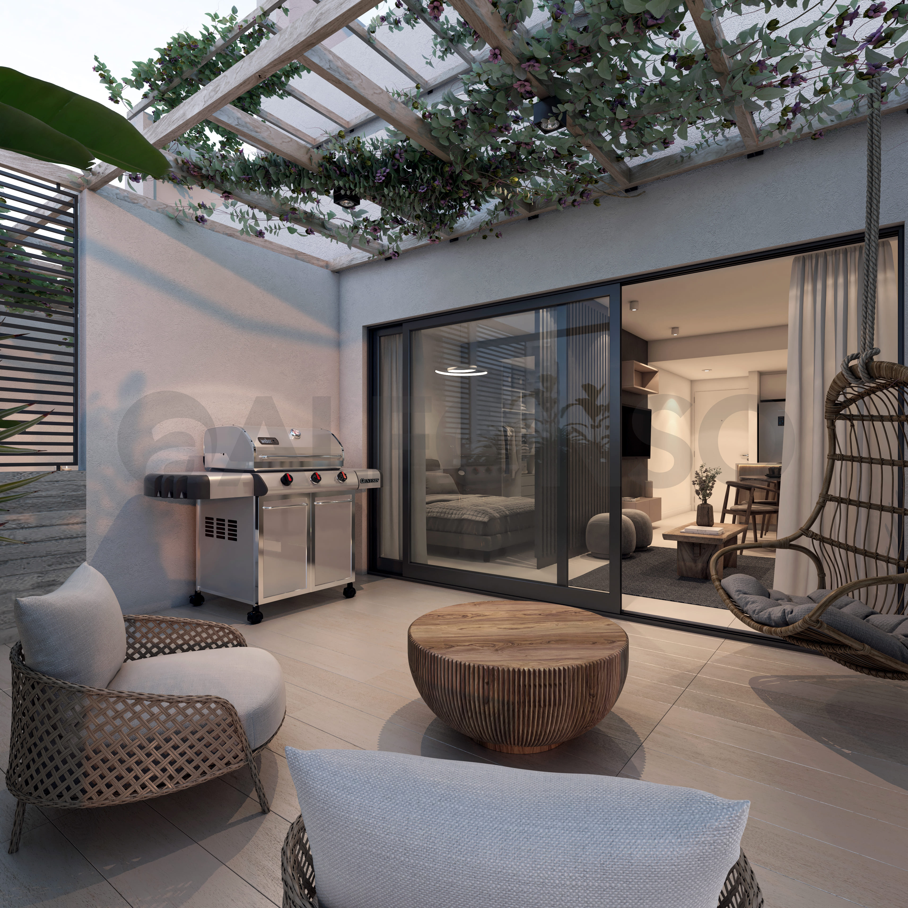 • Cocina equipada con muebles de melamina y mesada de cuarzo, equipada con anafe y horno eléctrico.