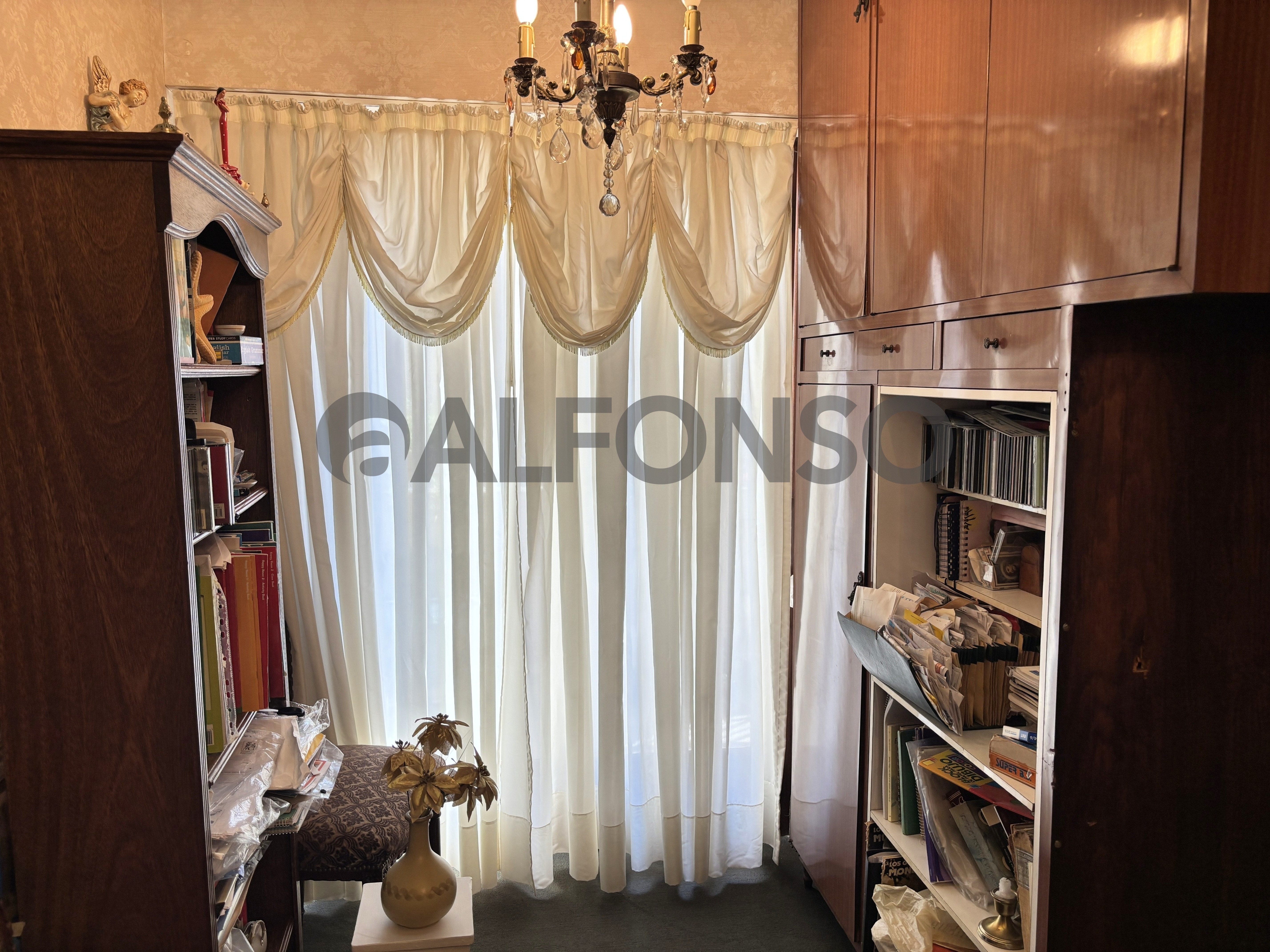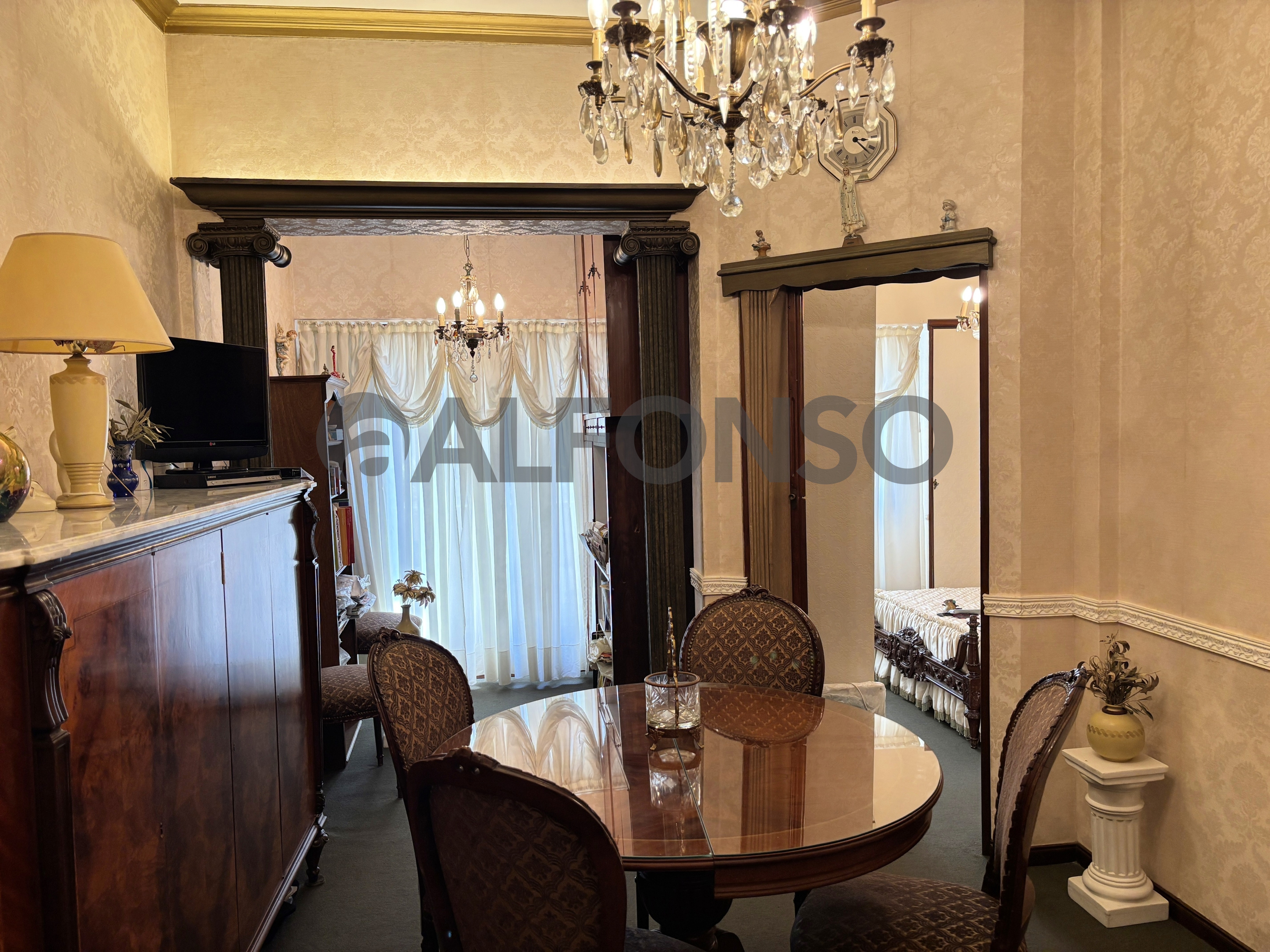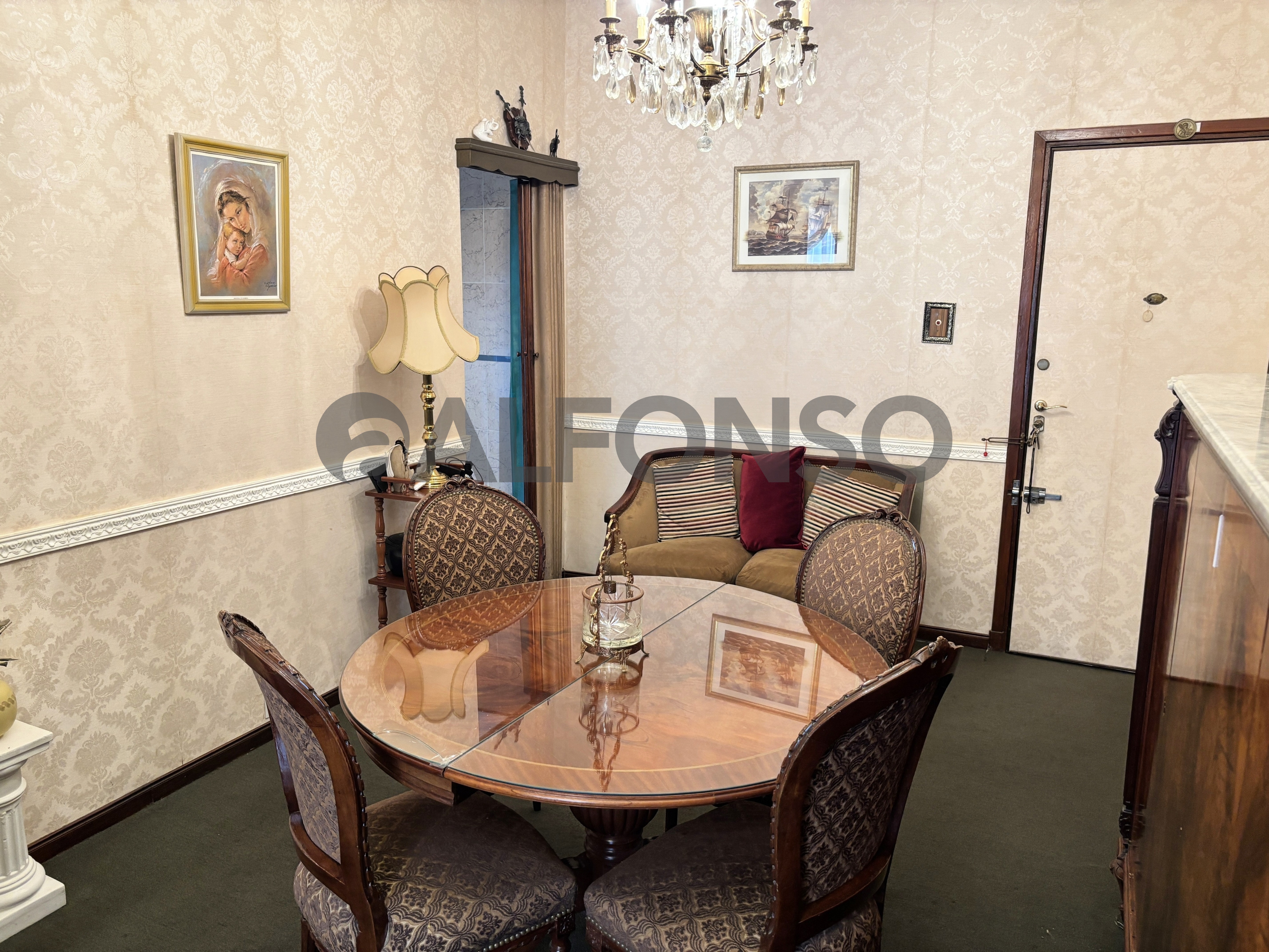 • Living alfombrado y empapelado, con balcón al frente.